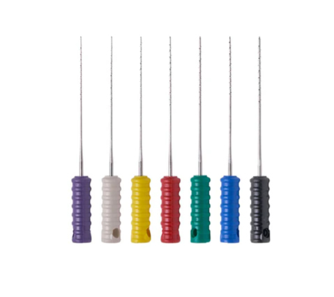 Stainless steel endodontic files designed for cleaning and shaping root canals. Flexible, precise, and available in assorted sizes for effective endodontic treatment.